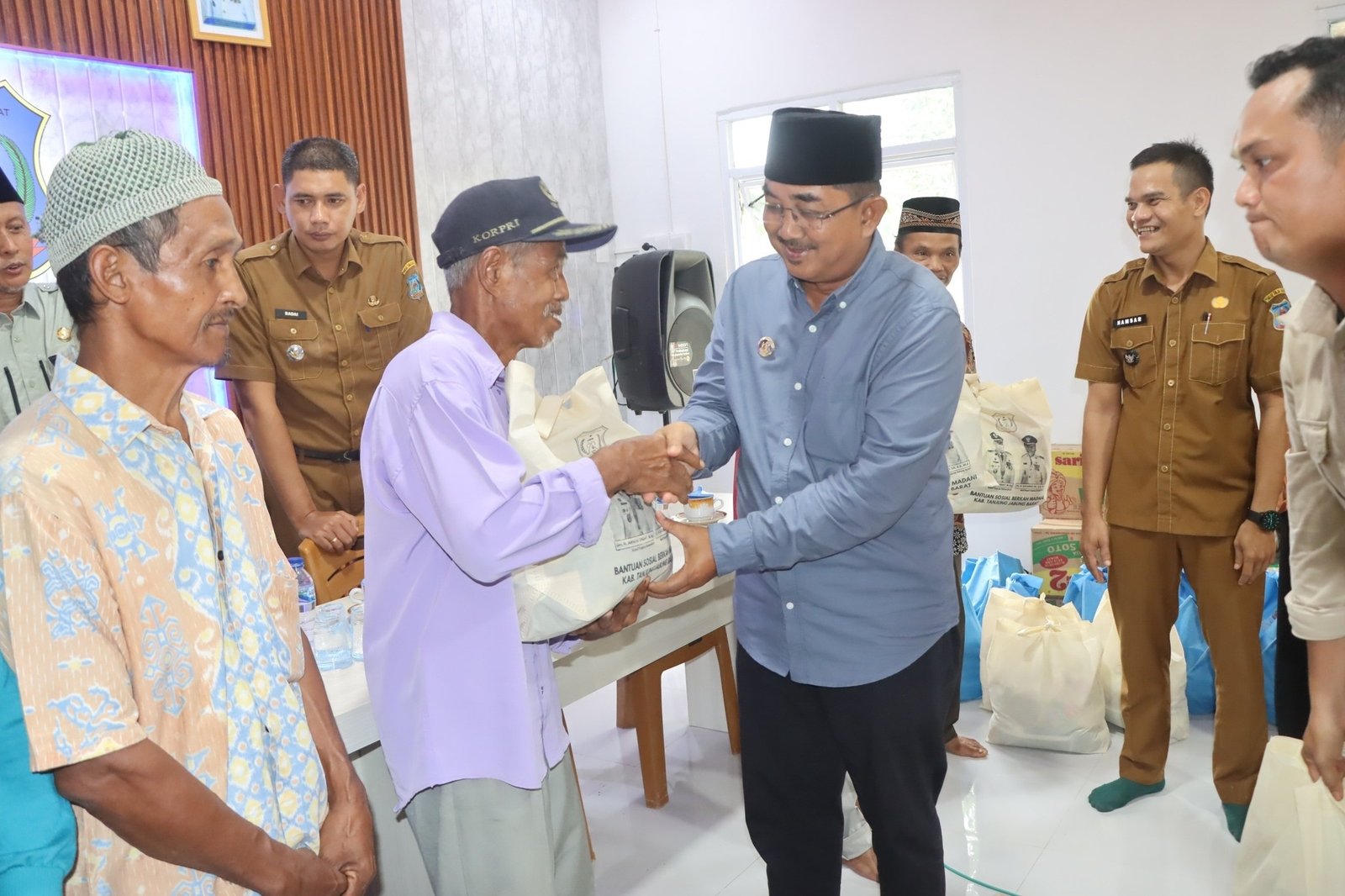 Gojambi.id. Kuala Tungkal-Bupati Kabupaten Tanjung Jabung (Tanjab) Barat, H. Anwar Sadat bersama Plt Kepala Dinas Sosial, H. Agus Sanusi gencar menyalurkan bantuan sosial (bansos) berupa paket Sembako kepada masyarakat kurang mampu dan miskin ekstrem, di Kecamatan Kuala Betara, bertempat di kantor Desa Tanjung Pasir, Selasa (16/09/2025).